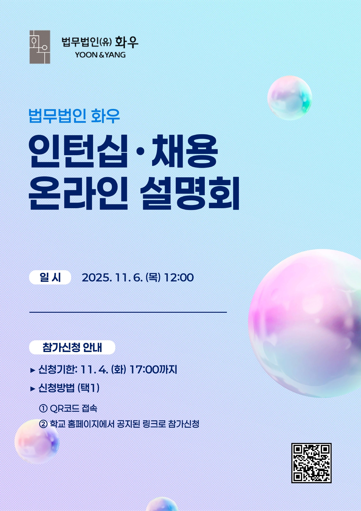 [법무법인(유한) 화우] 2025년 하반기 온라인 설명회 * 일시 : 2025. 11. 6. (목) 12:00 * 신청페이지 : https://forms.gle/72o6LQQd4wFUE8ta8 * 신청기한 : 11. 4. (화) 17:00까지 * 담당자 : 채용교육팀 박이선 부장, 조민주 사원(02-6003-7776, 7225) / Email : education@hwawoo.com |