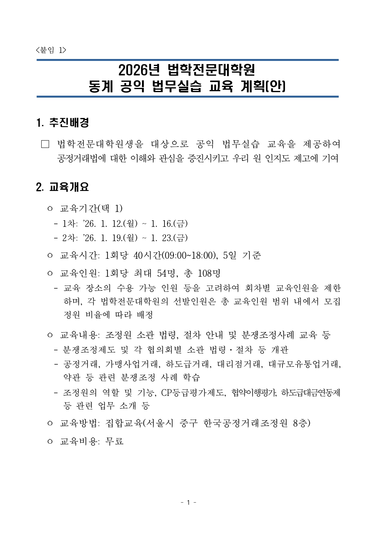 [2025 동계] 한국공정거래조정원 공익 법무실습 교육 모집(~11/20) 관리자 │ 2025-10-30 붙임1. 법학전문대학원 동계 공익 법무실습 교육 계획(안).pdf | 붙임2. 법학전문대학원 동계 공익 법무실습 교육 선발 인원.pdf | 붙임3. 법학전문대학원 동계 공익 법무실습 교육 선발자 명단 제출 양식.xlsx HIT 178 |