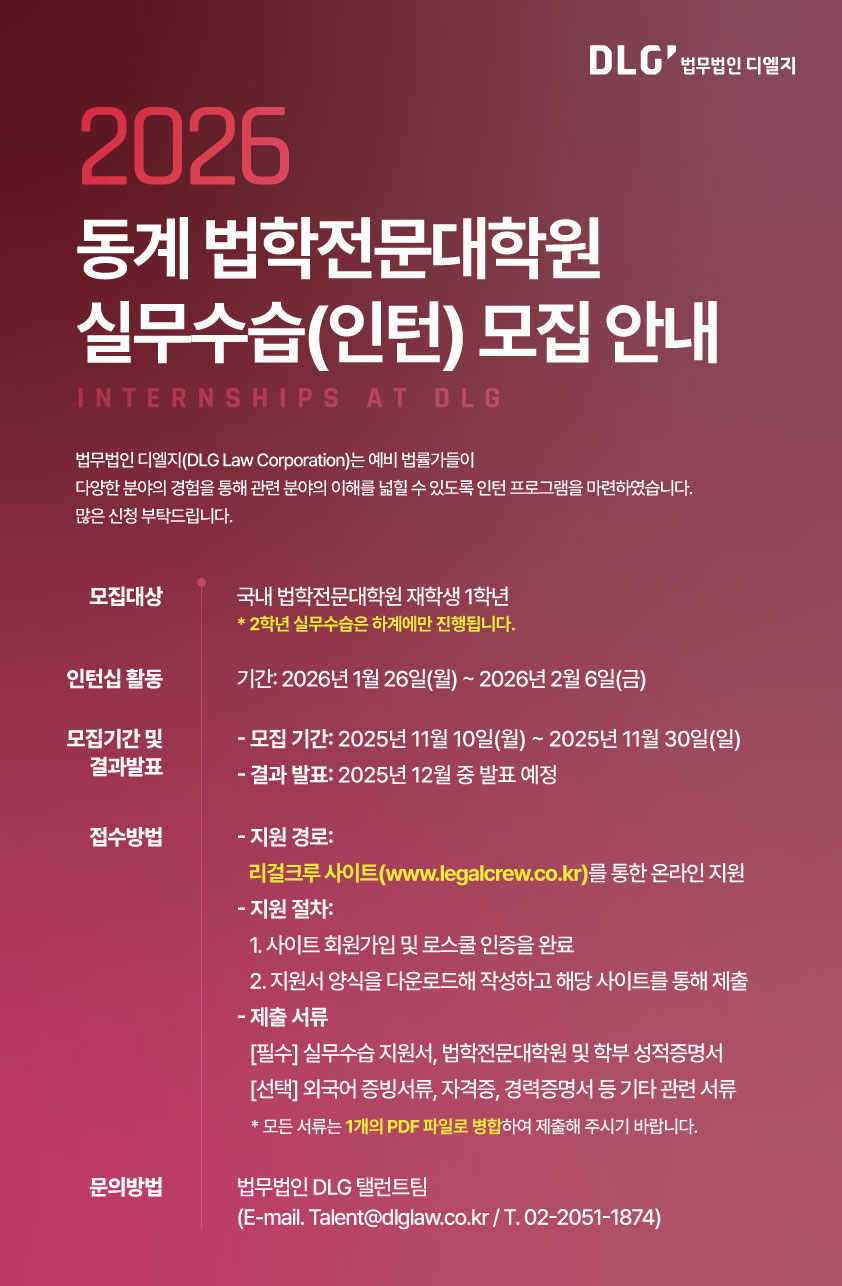 I. 모집대상 II. 실무수습 기간 - 2026년 1월 26일(월) ~ 2026년 2월 6일(금) III. 모집기간 및 결과발표 - 모집기간: 2025년 11월 10일(월) ~ 2025년 11월 30일(일) - 결과발표: 2025년 12월 중 발표 예정 IV. 지원방법 - 지원 경로: 리걸크루(LegalCrew | 리걸크루) 사이트를 통한 온라인 지원 - 지원 절차: 사이트 회원가입 및 로스쿨 인증을 완료한 후, 지원서 양식을 다운 로드해 작성하고 해당 사이트를 통해 제출 - 제출 서류: [필수] 실무수습 지원서, 법학전문대학원 및 학부 성적증명서 [선택] 외국어 증빙서류, 자격증, 경력증명서 등 기타 관련 서류 모든 서류는 1개의 PDF 파일로 병합하여 제출해 주시기 바랍니다. V. 문의 및 기타 - 탤런트팀 (E-mail. Talent@dlglaw.co.kr / T. 02-2051-1874)