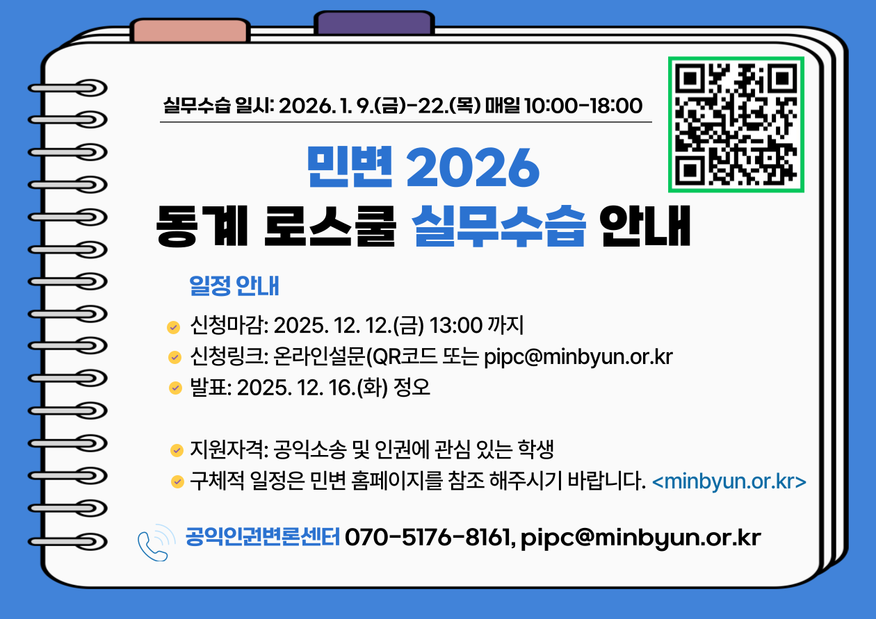 1. 실무수습 목표 법학전문대학원 학생들의 공익인권법에 대한 관심과 열정을 고취함과 아울러 예비 법률가로서의 기본적인 법률지식과 실무능력을 함양함. 2. 실무수습 기간 : 2026. 1. 9.(금) ~ 22.(목) 매일 10:00 ~ 18:00 3. 근무 장소 - 서울 서초구 서초동 소재 민변 사무실(사무처) 및 서울 소재 민변 회원 사무실 - 부산, 광주지역에 위치한 민변 지역회원 사무실 (신청이 있는 경우에 한해서) * 광주 또는 부산지역에 위치한 민변 지역회원 사무실의 경우, 협의하에 기간을 변경할 수 있음 (지부에서 실무수습 진행하는 경우, 본부 프로그램과 다르게 진행됩니다) * 신청 최종마감 후, 민변 사무처에서 임의로 배정함. 4. 지원 방법 ○지원기간: 2025. 12. 12.(금) 13:00 까지 ○발표: 2025. 12. 16.(화) 18:00 ○동계실무수습 지원서(양식)를 pipc@minbyun.or.kr로 발송하거나 온라인 설문 (https://forms.gle/uU4Ea3dTfMcrZ3xY7)에 내용 기입하여 신청 5. 지원 자격 ○공익소송 및 인권에 관심이 있는 학생 (학교내 인권법학회원 또는 공익·인권 활동경험이 있는 학생) 6. 프로그램 ○ 민변(공익인권변론센터)에서 실무수습 프로그램을 주관하며, 세부적인 수습프로 그램은 각 지도변호사 사무실에서 진행함. <민변(공익인권변론센터) 프로그램> - 민변 및 공익인권 분야 특강: 2회 - 모의기록검토 및 작성 (모의기록을 중심으로 소장, 답변서, 준비서면 작성) - 민변이 주최(참가), 민변 회원이 관여하는 기자회견, 학술대회, 토론회 등 참관 - 민변 내 위원회 회의 등 참관 <각 지도변호사 사무실 프로그램> - 기록검토 및 작성: 2건 내외 - 법정방청(가능한 경우): 2건 이상 ※ 구체적 일정과 강의 주제 및 강사 등은 추후 확정하여 공지할 예정이며, 위 계획은 민변 또는 관련 단체 사정 등에 따라 변경될 수 있습니다. ※ 위 내용과 관련하여 문의할 사항은 민변 공익인권변론센터 (pipc@minbyun.or.kr, 070-5176-8161)로 연락하여 주시기 바랍니다. |