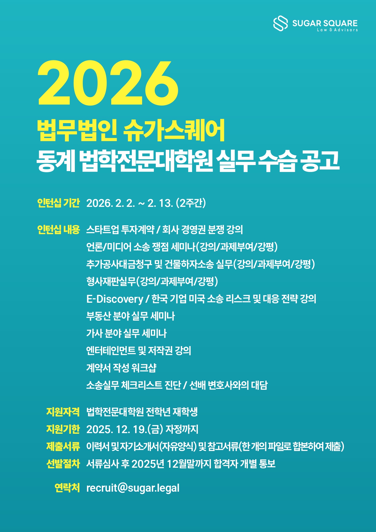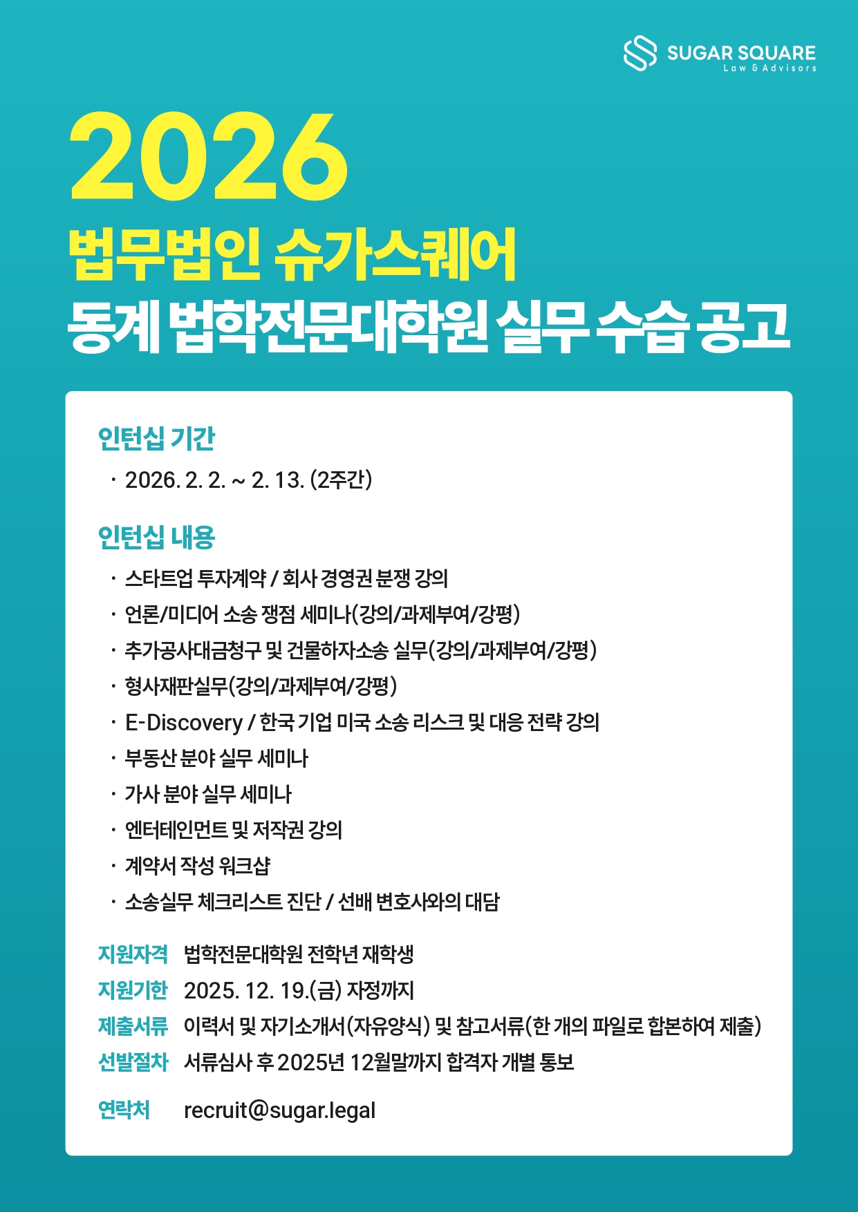 [2025 동계] 법무법인 슈가스퀘어 법학전문대학원 인턴십 프로그램